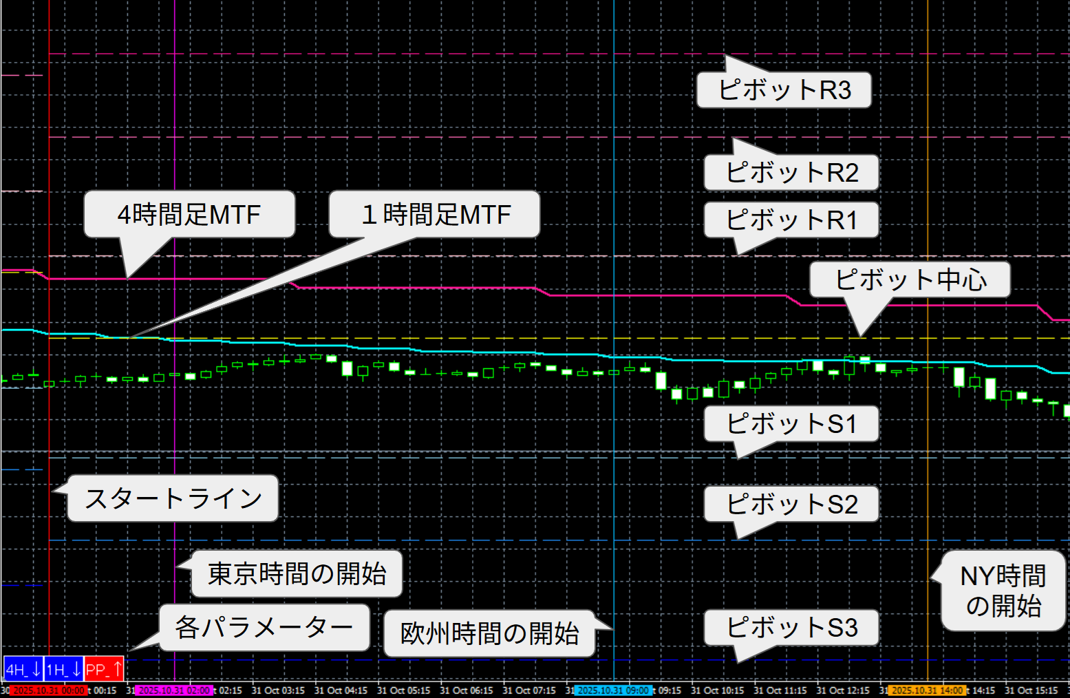 ・真ん中:『1H_↑』、『1H_↓』は、1足前の終値が1時間足MTの上にいるか、下にいるかを表す(図は下にいることを表す)