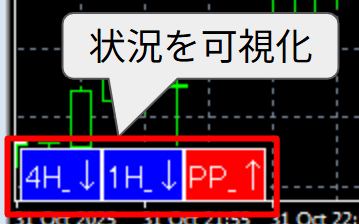 合わせて、左下に1本前にローソク足の終値が、1時間足、4時間足のどちらで終わっているかを把握して「矢印」で方向を示します。