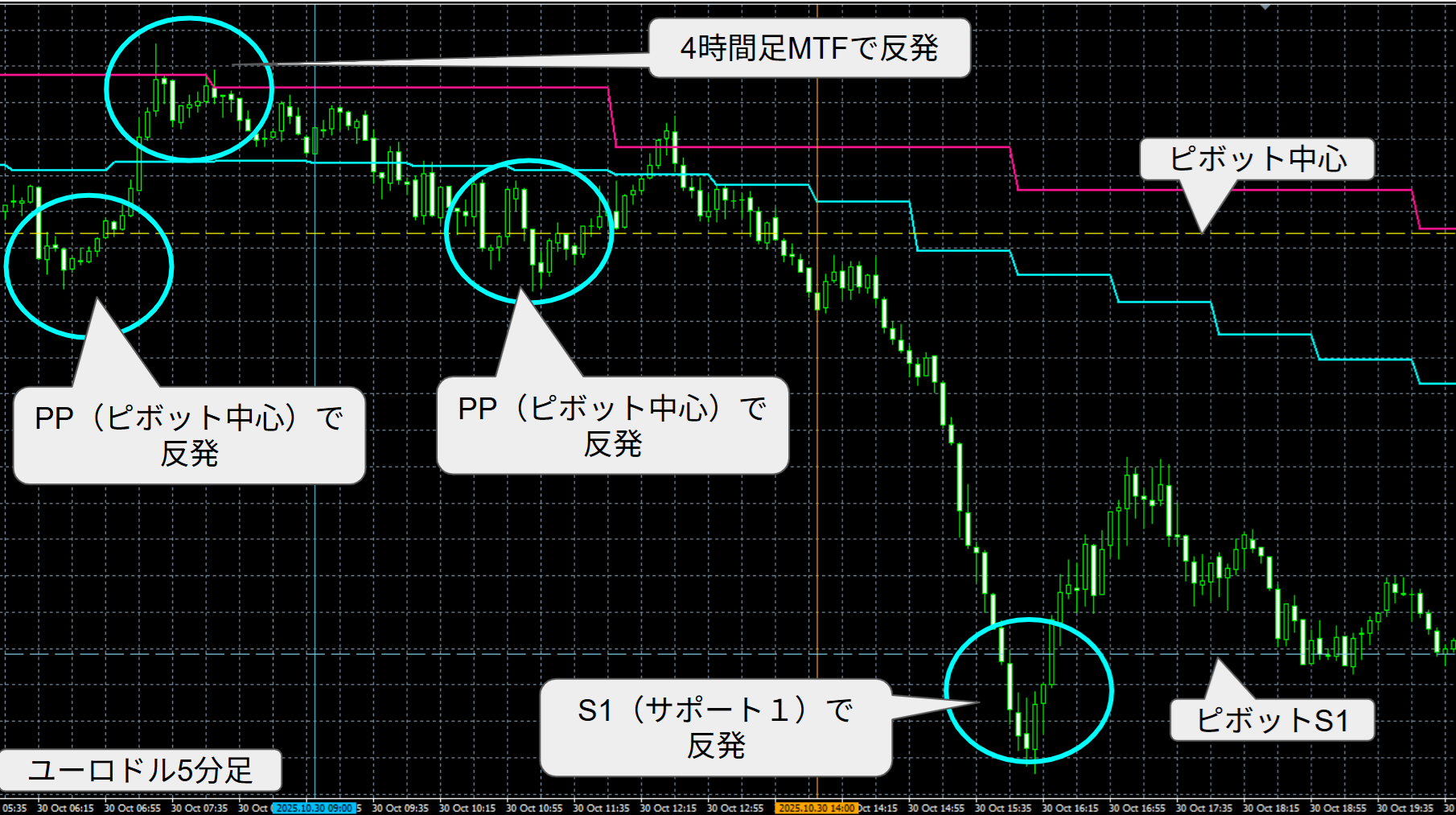 【図:ピボットラインから反発する場面など(EURUSDの5分足表示】