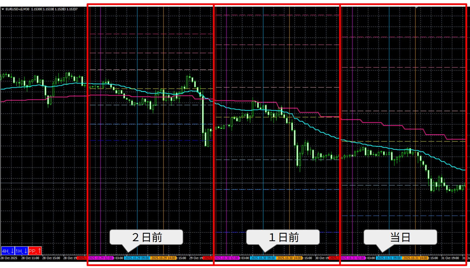 (例:本日が10/31なら、2日(10/29)は、10/28の高値、安値の値を基準に、10/29のチャートに描画されています)