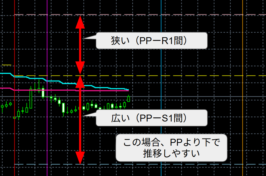 | P−R1 が狭い / P−S1 が広い | 終値が安値寄り(陰線) | 弱気 | 翌日も下落しやすい(弱気継続) |