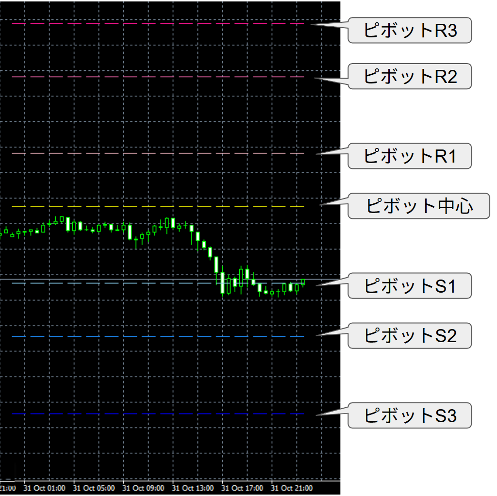 ピボットのラインを以下の計算式を基に、本日のチャートに自動で引きます(※全て前日の高値、安値の値を使います)