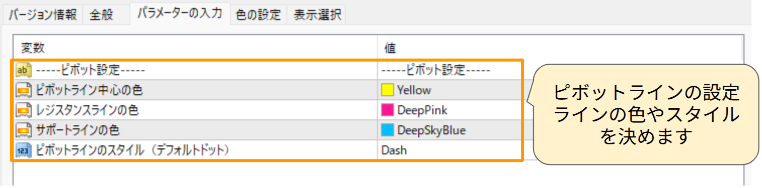 ◎ピボットライン・・・色とスタイルを設定できます。(非表示にはできません)