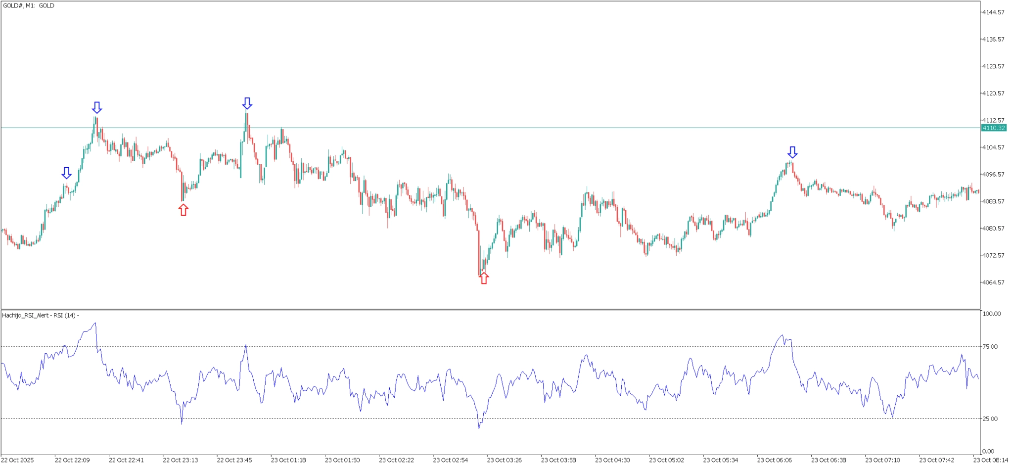 初期セットは期間14・レベル75/25推奨。 サイン点灯時は上位足の方向やサポレジ、MAの傾きと重ねてコンフルエンス確認、損切りは直近高安/ATR基準、利確は節目or固定RRで一貫化すれば、検証から実運用まで手順が一本線に。 表示は上下別の矢印色・サイズ、RSIライン色、過去バーの表示数まで自由にカスタム可能。