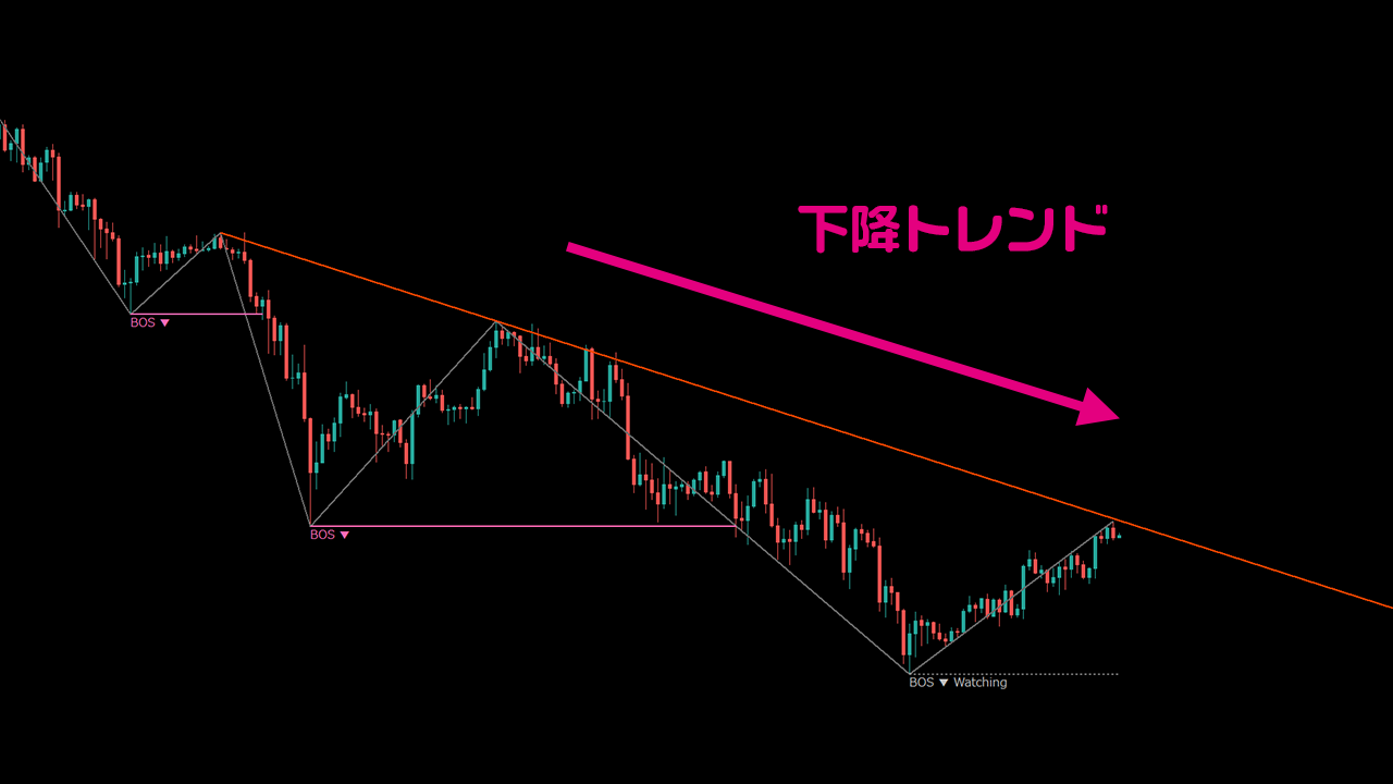 ・【BOS(下降)】:下降トレンドに転換 → 直近安値(L/L)をブレイク。