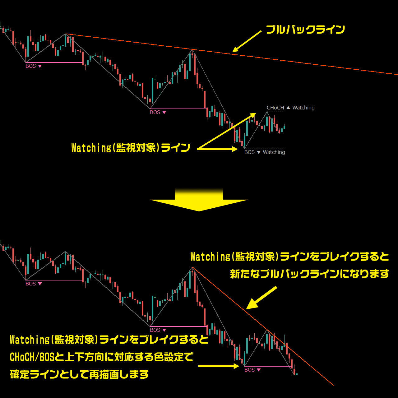 ★本インジケーターは、Watching構造の発現/消滅、および CHoCH/BOSの確定 を検出した際にアラートを発します。