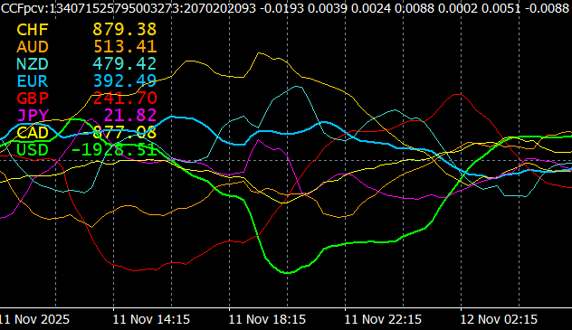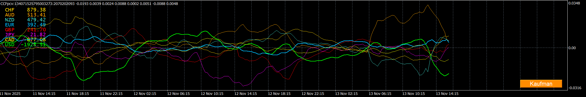 → 方向性だけを抽出し、細かいタイミングは他インジで補う。Currency Strength Analyzer with Kaufman.ex4