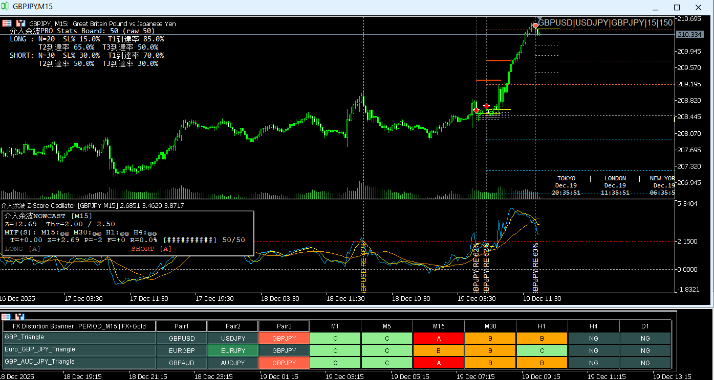 オシレーター描画速度を大幅改善 → 時間足切替後の “待ち時間” が過去比で大きく減少。 Z=0 到達時の Z-Exit 水平線が正しく描画されるよう修正。 統計ダッシュボード(Stats)を軽量化 → 不要な再計算を排除し、動作が滑らかに 3通貨の価格コピーを一括化