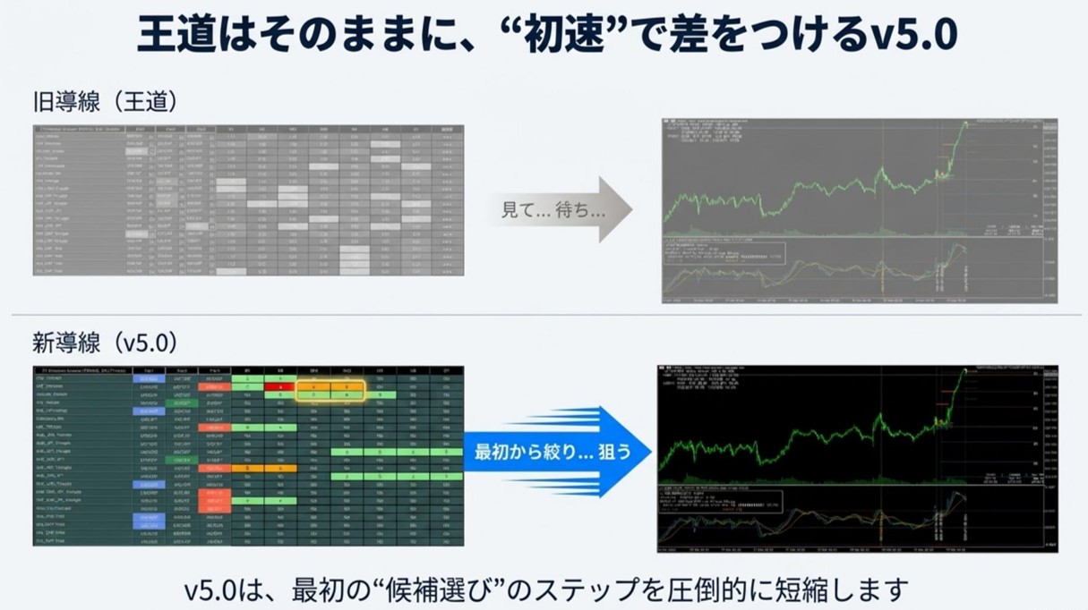 歪みは永続しません。見つけるまでに時間がかかれば、その局面は既に終わる。v5.0は「最初の一歩」を短くし、短命な局面での機会損失を抑えやすくしました。