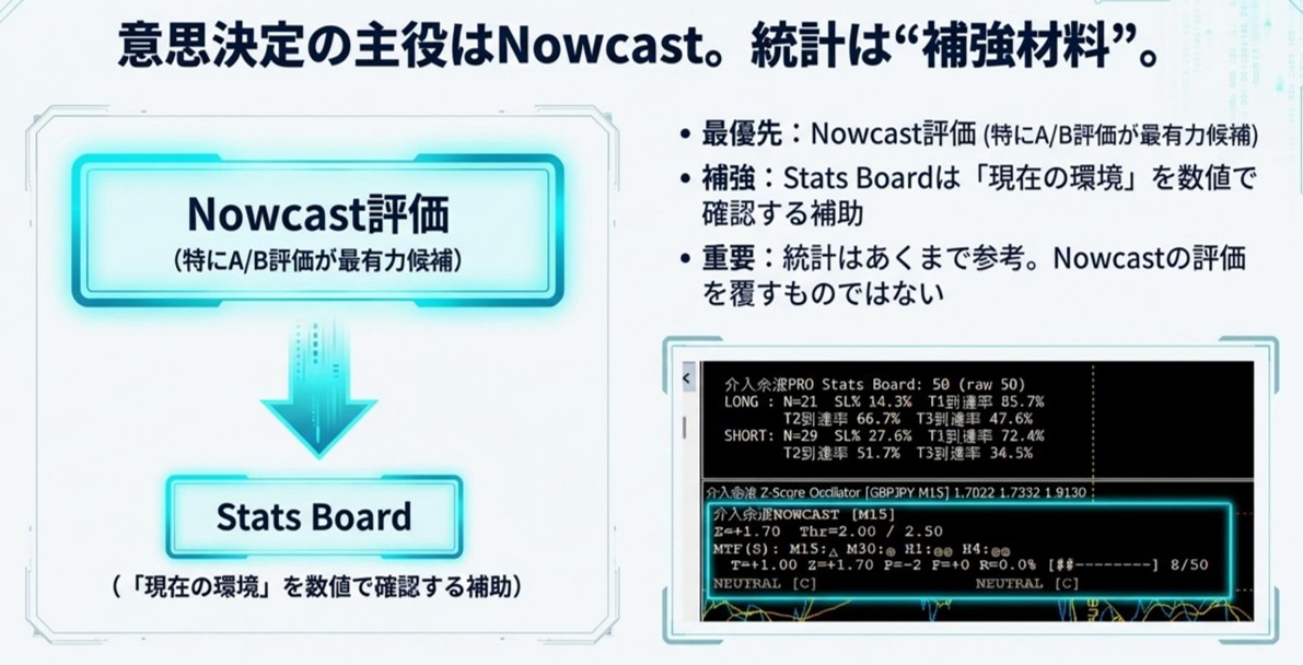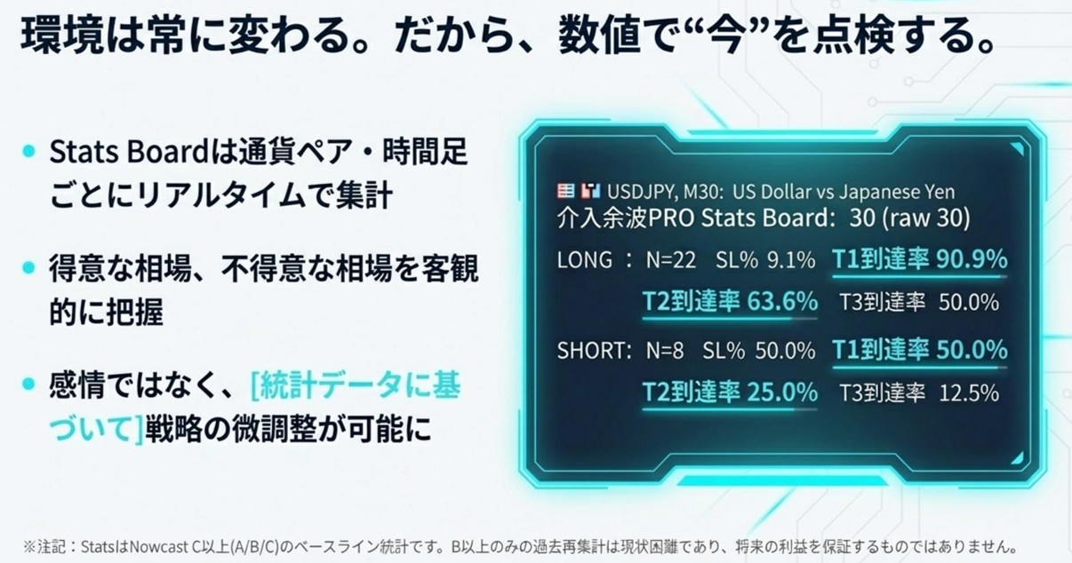 Stats Boardは、Nowcast評価がC以上(A/B/C)の局面を母集団として、直近N回の結果(SL率、TP1TP3到達率)を集計し、現状の相場環境を数値で補強する機能です。