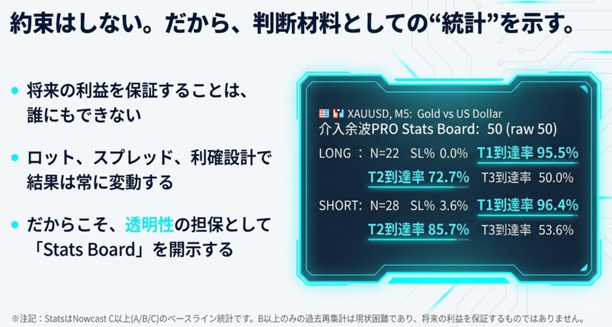 本商品は将来の利益を保証しません。ロット、スプレッド、執行、利確設計で結果は変わります。その代わり、意思決定の透明性を担保するため 統計ダッシュボードを開示します。