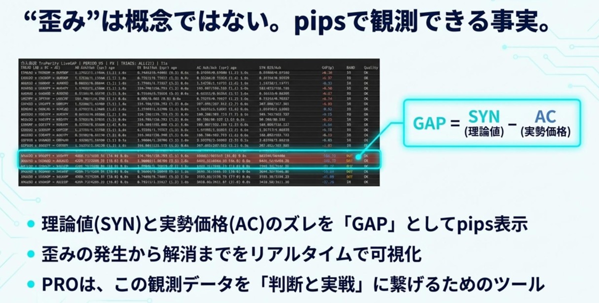 LiveGAPは、理論値(SYN)と実勢(AC)のズレをGAPpips)として表示し、歪みの発生と解消をリアルタイムで観測できます。 「歪みの立証と観測」の入口として機能します。
