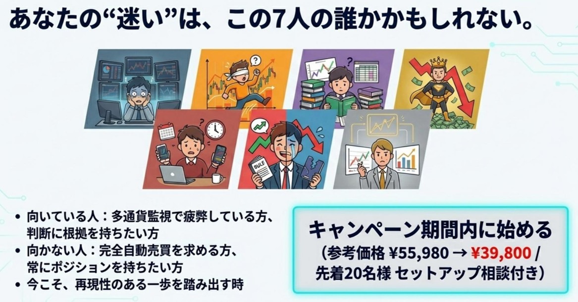 これにより、「利確・撤退判断を“感覚”から“設計”へ」移行しやすくなり、裁量運用でもEA運用でも同じ思想で扱える形に寄せています。