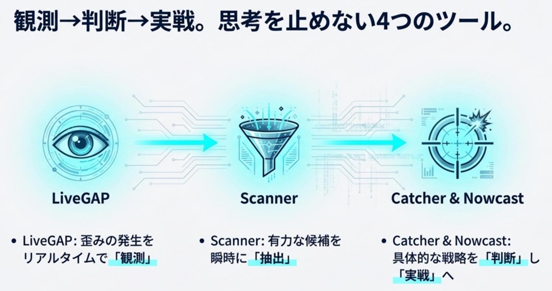 Scannerで鳥瞰 → Catcherで待ち → Nowcastで最終フィルター」