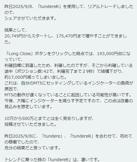 tundereRの完成版はエントリー方向へ伸びた場合戻しですぐにマイナスになってしまいますが、そこを微益利確と指値の復活と全体利確機能などで補っています。 tundereは微益利確や相殺、指値復活の機能があります。 違いはマイナスからプラスを狙うのか(tundere)、プラスをいかに確保しながらTPを目指すのか(R)の違いがあり、R視聴特典EAを作成した時には微益利確や指値復活をどう活用できるのかアイディアがないまま作成し今の形になりましたが、ついに完成版が販売開始になりました。