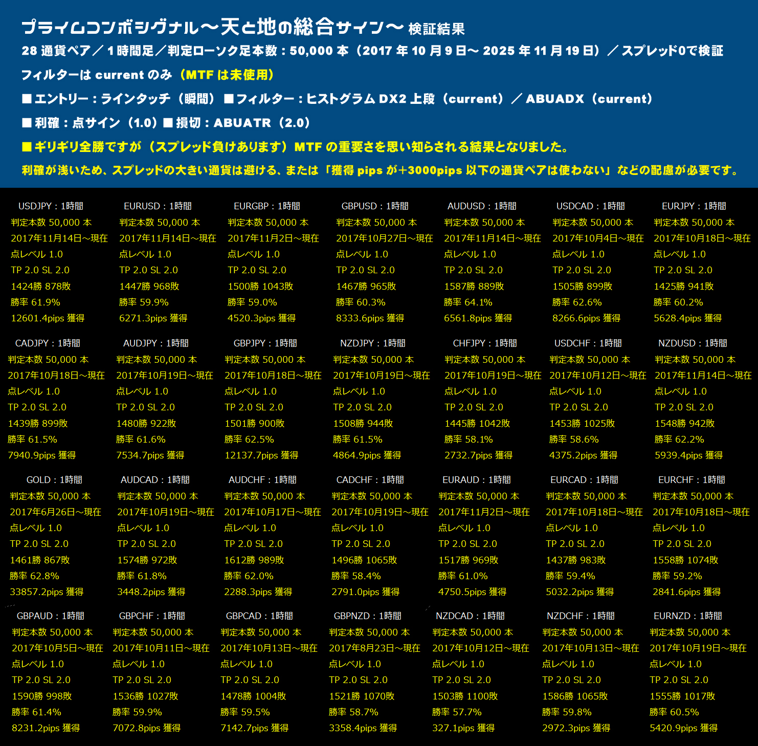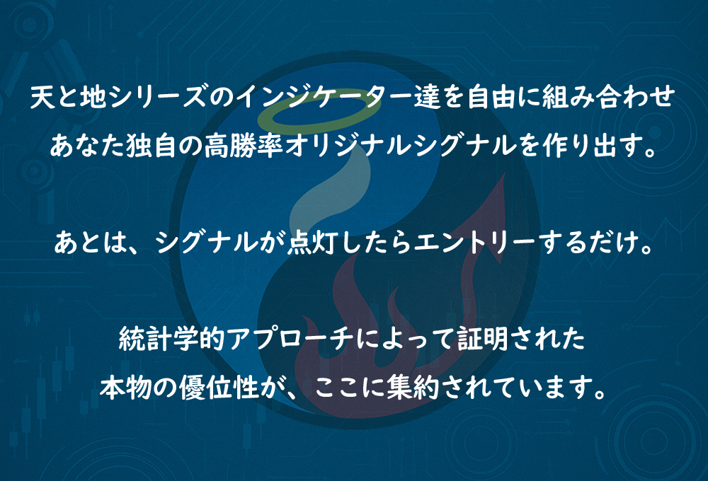 「天と地」シリーズの最終進化形。完全無裁量でサイン点灯と同時にSL・ロットを自動算出。過去の勝敗・勝率・獲得pipsも一目で確認できる、直感で勝負する新時代のシグナルシステム。