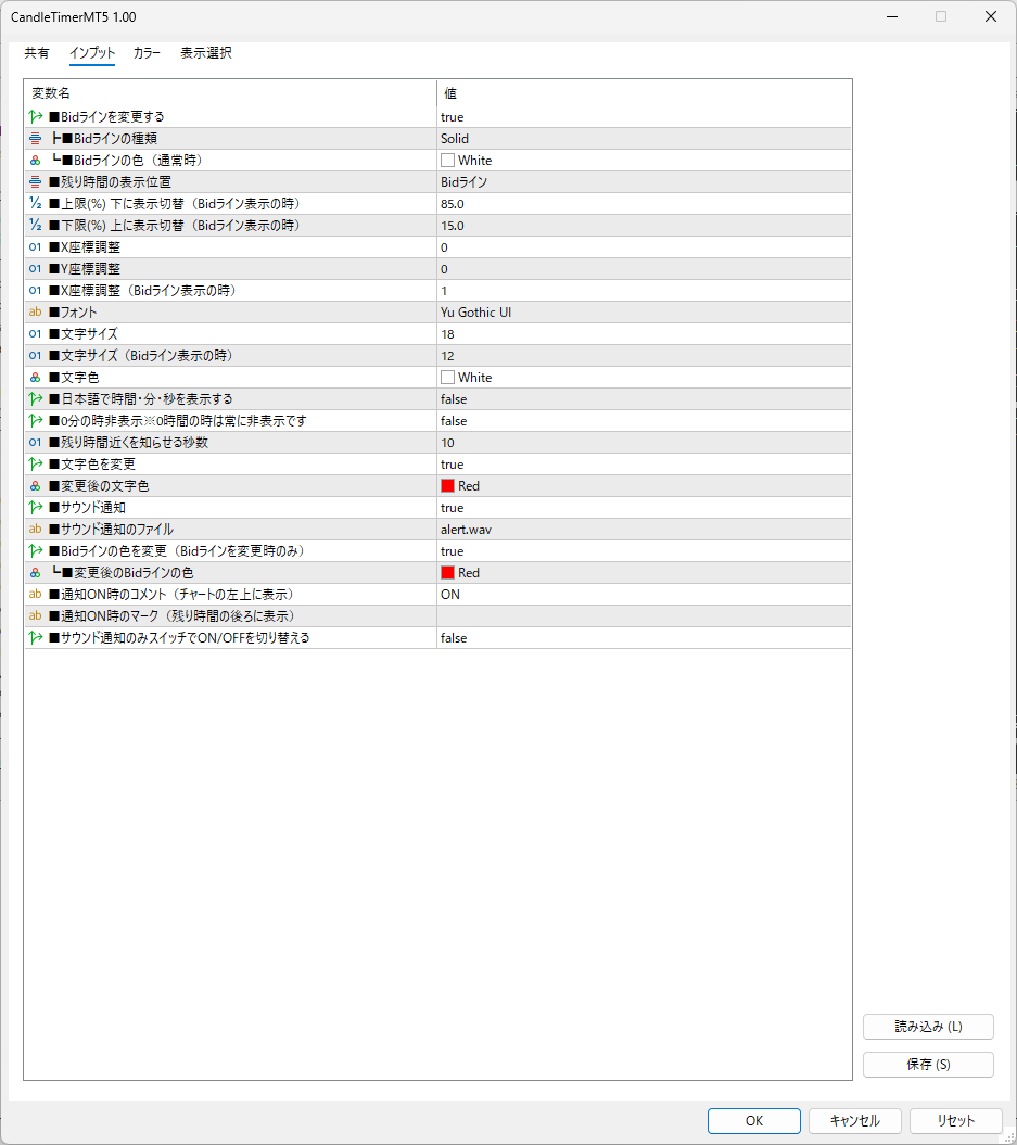 これで『「文字色を変更」・「サウンド通知」・「Bidラインの色を変更(Bidラインを変更時のみ)」の中で実行させたいものをtrue』にしたものが「残り時間近くを知らせる秒数」で設定した秒数に実行されます。