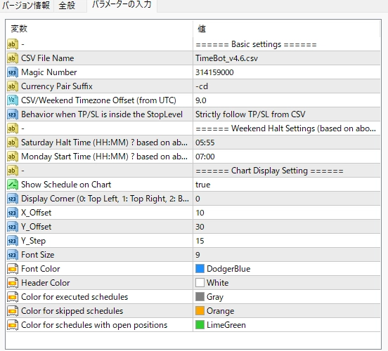 Lotサイズ、許容スリッページ、最大スプレッド、TP/SLなどもCSVファイル上で取引ごとに個別設定可能です。 - 週末のトレード管理
