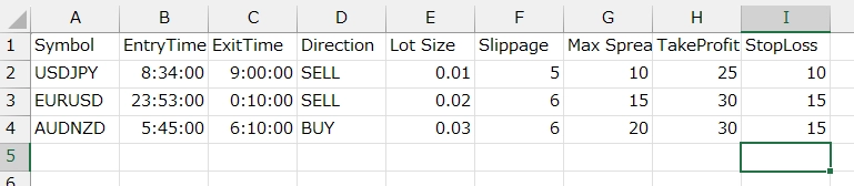 Symbol ,Entry Time,Exit Time,Direction,Lot Size,Slippage,Max Spread,Take Profit,Stop Loss EURJPY ,09:55:00 ,10:08:00 ,SELL ,0.10 ,3 ,20 ,50 ,30 EURUSD ,10:10:00 ,10:23:00 ,BUY ,0.20 ,2 ,15 ,40 ,25
