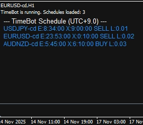 TimeBot_MT4は、あらかじめ作成されたCSVファイル(例:TimeBot_v4.6.csv)に基づいて、指定された「時間」「通貨ペア」「ロット数」などの情報通りに自動でエントリー・決済を行う高精度トレード支援EAです。
