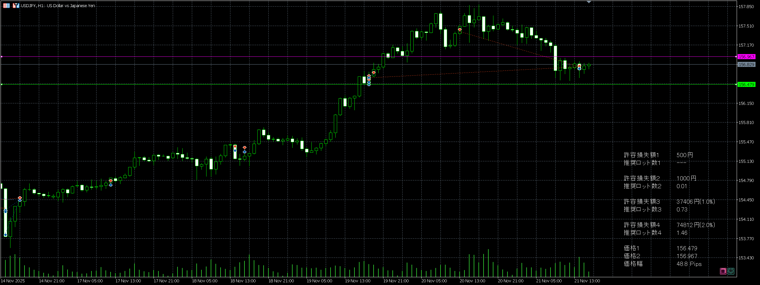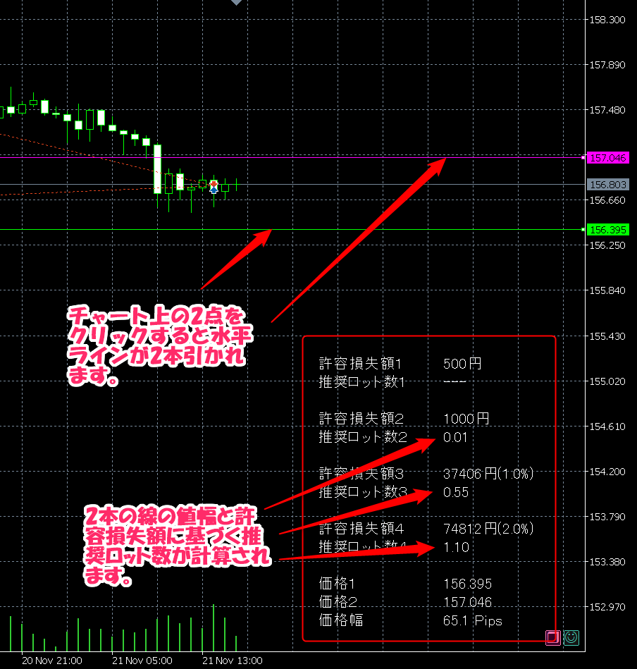 この 2 点間の値幅をもとに、各リスクパターンに対する 推奨ロット数 を自動計算します。