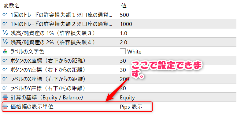 価格幅の表示形式は、入力パラメータから Pips 表示 / Points 表示 のどちらかを選択できます。