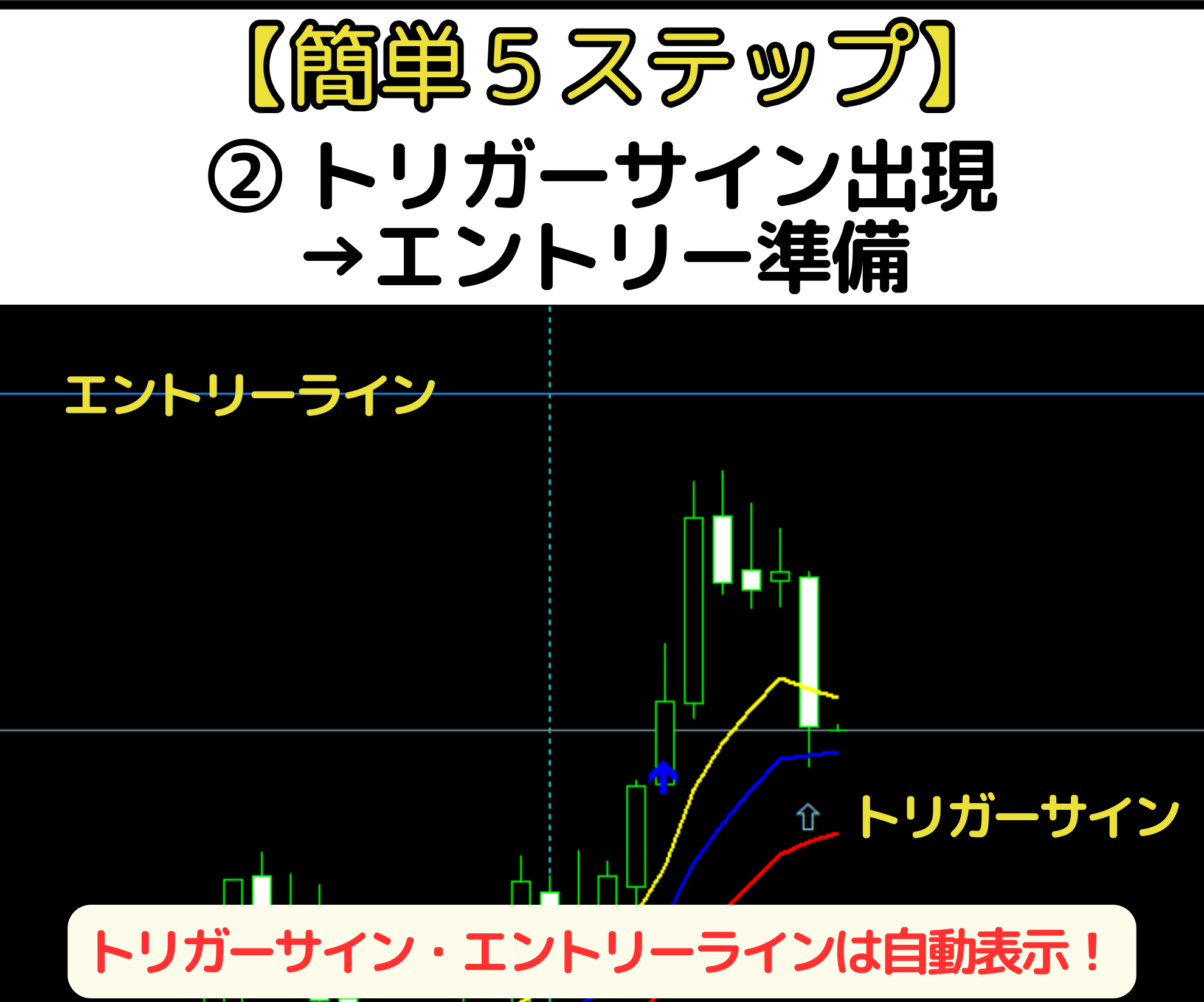 トリガーサイン・エントリーライン・利確/損切りラインが自動計算&表示されるので、