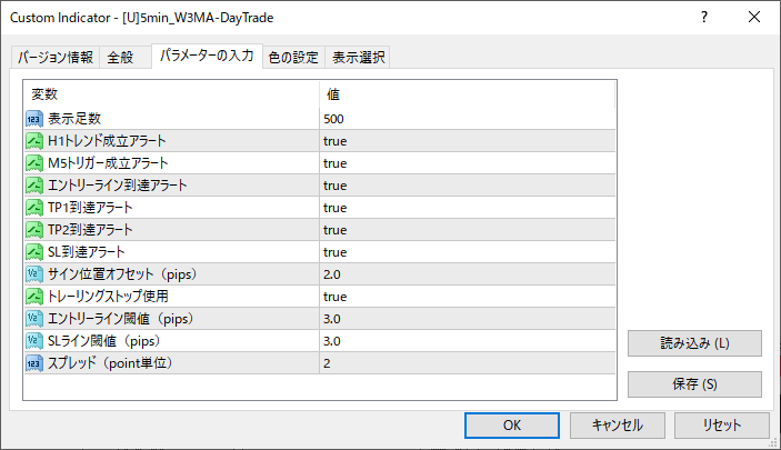 調整可能な項目は以下の通りです。 ・各種アラートON/OFF ・エントリーライン・TP/SLラインまでの距離設定 ・サイン位置、スプレッド設定(検証用) 特に「エントリーライン・TP/SLラインまでの距離」は、通貨ペアによって最適な数値が異なります。 ご自身のトレードスタイルに合わせて調整してみてください。