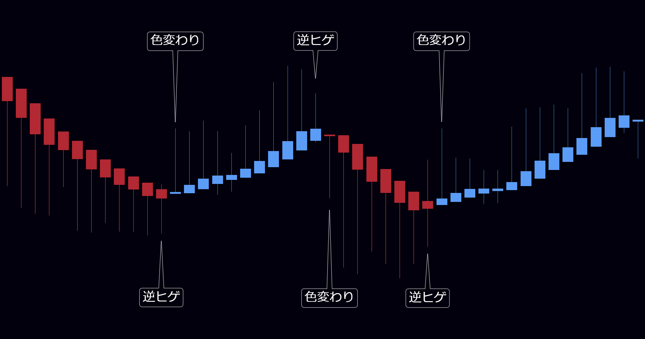 平均足 短期で、陽線で下ヒゲ、陰線で上ヒゲになること(反転注意シグナル)