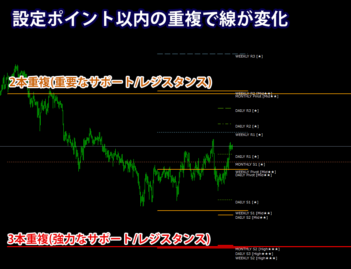 3本以上の時間軸のピボットレベルが重複している箇所の表示色。極めて重要なレベルのため、目立つ色で設定します。 |