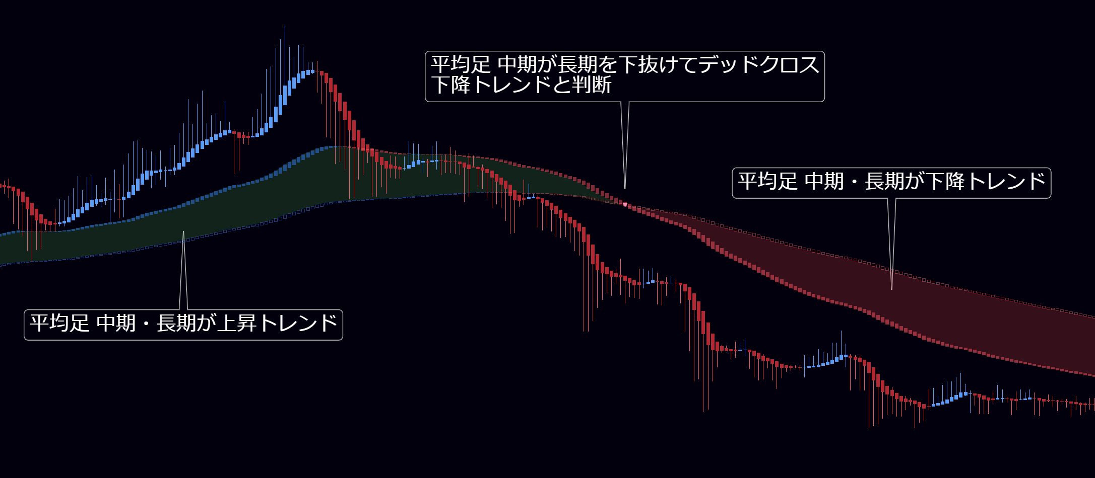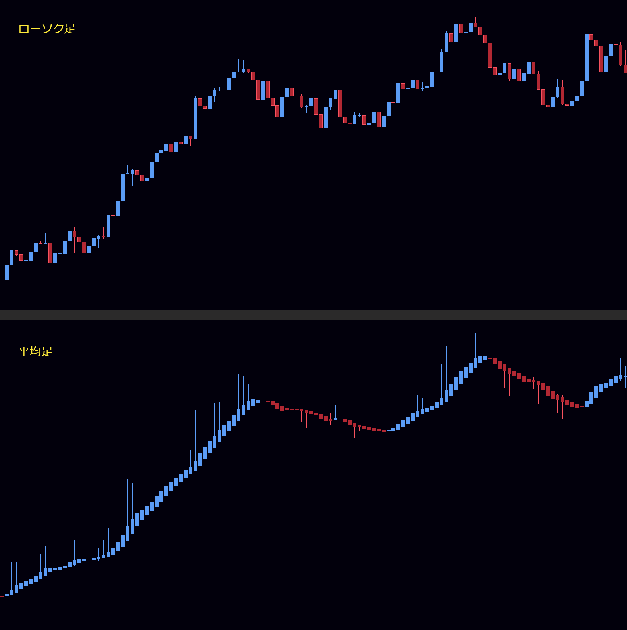 ■平均足とは?  平均足は、ローソク足の「始値・高値・安値・終値」をそのまま使うのではなく、平均値を使って滑らかにしたローソク足のことです。  ノイズを減らし、トレンド方向を視覚的に分かりやすくするために作られています。 ■ローソク足との違い ・ ローソク足  実際の値動きをそのまま表示  ヒゲ・逆行・ダマシが多い  トレンドは読みにくいが“生の動き”が分かる ・平均足  過去と現在の価格を平均化して描画  通常のローソク足より 滑らかで方向性がハッキリ  陽線連続 → 上昇トレンド  陰線連続 → 下降トレンド  ノイズが少なく、初心者でも流れを掴みやすい