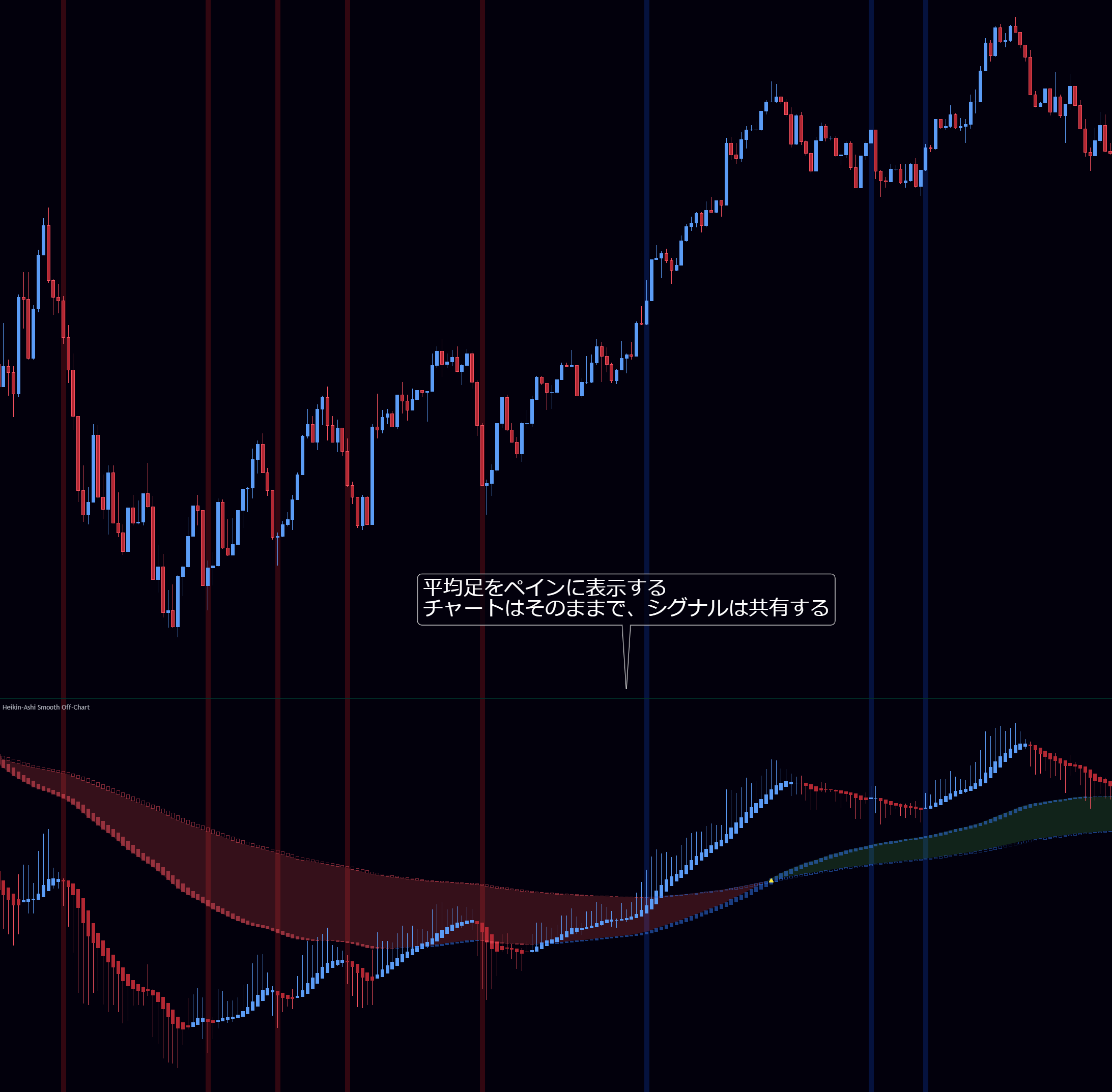 チャートを汚さず、流れだけを抽出。短期・中期・長期の揃いと転換を別ペインで見抜くスムーズ平均足 Off-Chart。