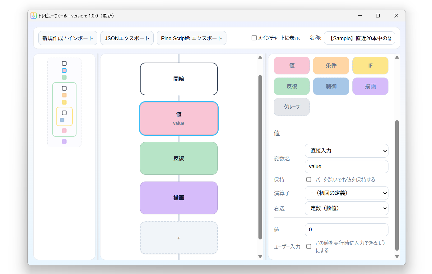 トレビューつくーるは、TradingView® のチャートに表示されるインジケーターを、ノーコードで組み立てられるビルダーです。