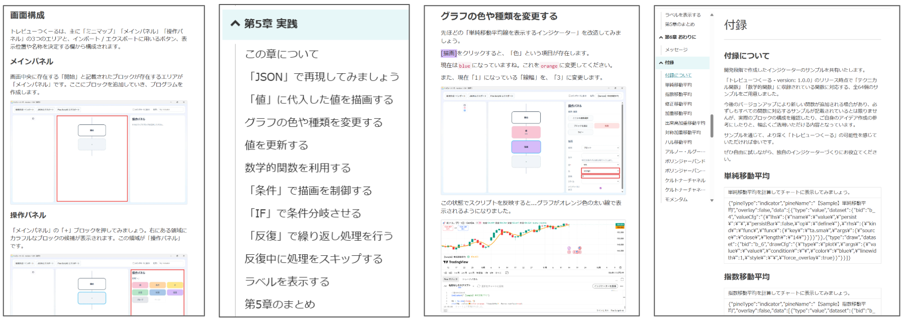 マニュアルには、そのトピックで解説中のインジケーターを再現するためのJSONファイルが記載されています。お手元のPC上でブロックの状態を完全再現した状態で読み進めることが可能です。