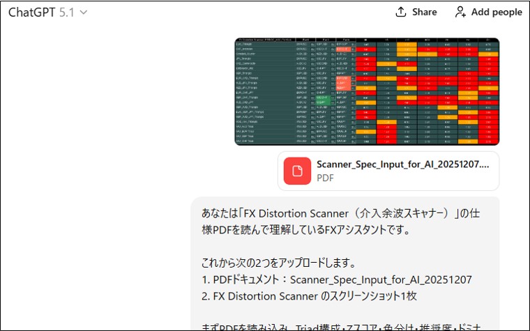 エントリー候補やトレード後の場面で、Scannerの画面をスクリーンショットにしてChatGPTなどの生成AIに渡すと、「今日の候補を3つに絞る」「今日の通貨テーマを文章で整理する」「そのエントリーが妥当だったか」を第三者目線で解説させることができます。同梱のプロンプトPDFとAI解析用Scanner仕様書PDFを使えば、スクショを1枚用意するだけで、環境認識や振り返りを視覚+テキストの両面から行えるようになります。