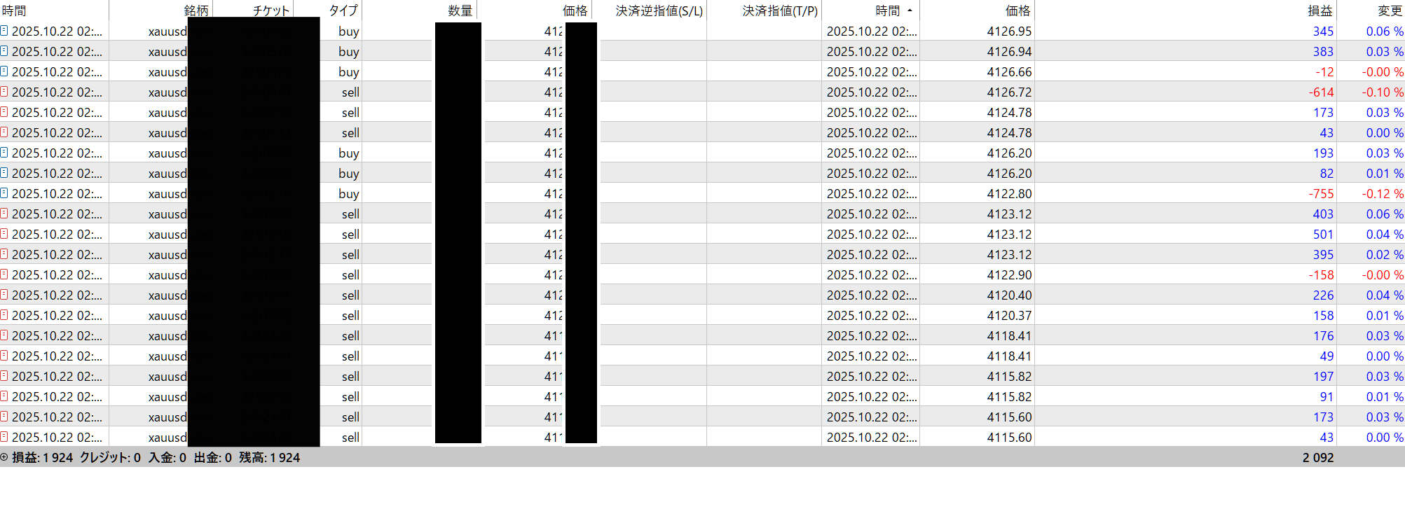サーバー時間の2時台、日本時間で午前9時です。仕事に行っている間に自動でエントリー・決済を繰り返し、スマホでも確認してみたら+2,092円。 買いと売りを繰り返しながら、着実に利益を積み重ねました。
