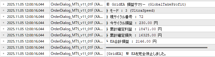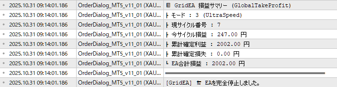 今回も目標利益2,002円を設定して稼働。 累計確定利益2,002円で自動停止。損失ゼロで完璧な勝ち逃げ達成。