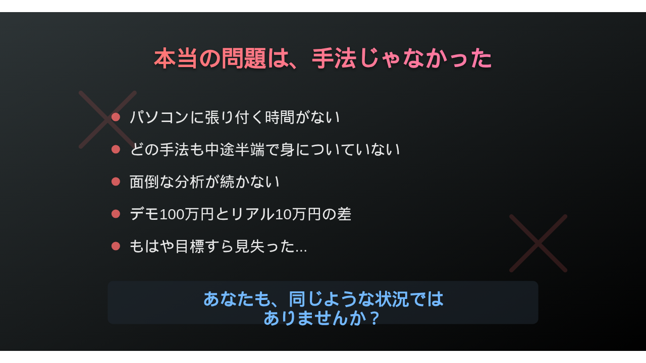 - 「100万円で月利30%」みたいな例は見せてくれるけど、10万円口座でどうすればいいかは教えてくれない