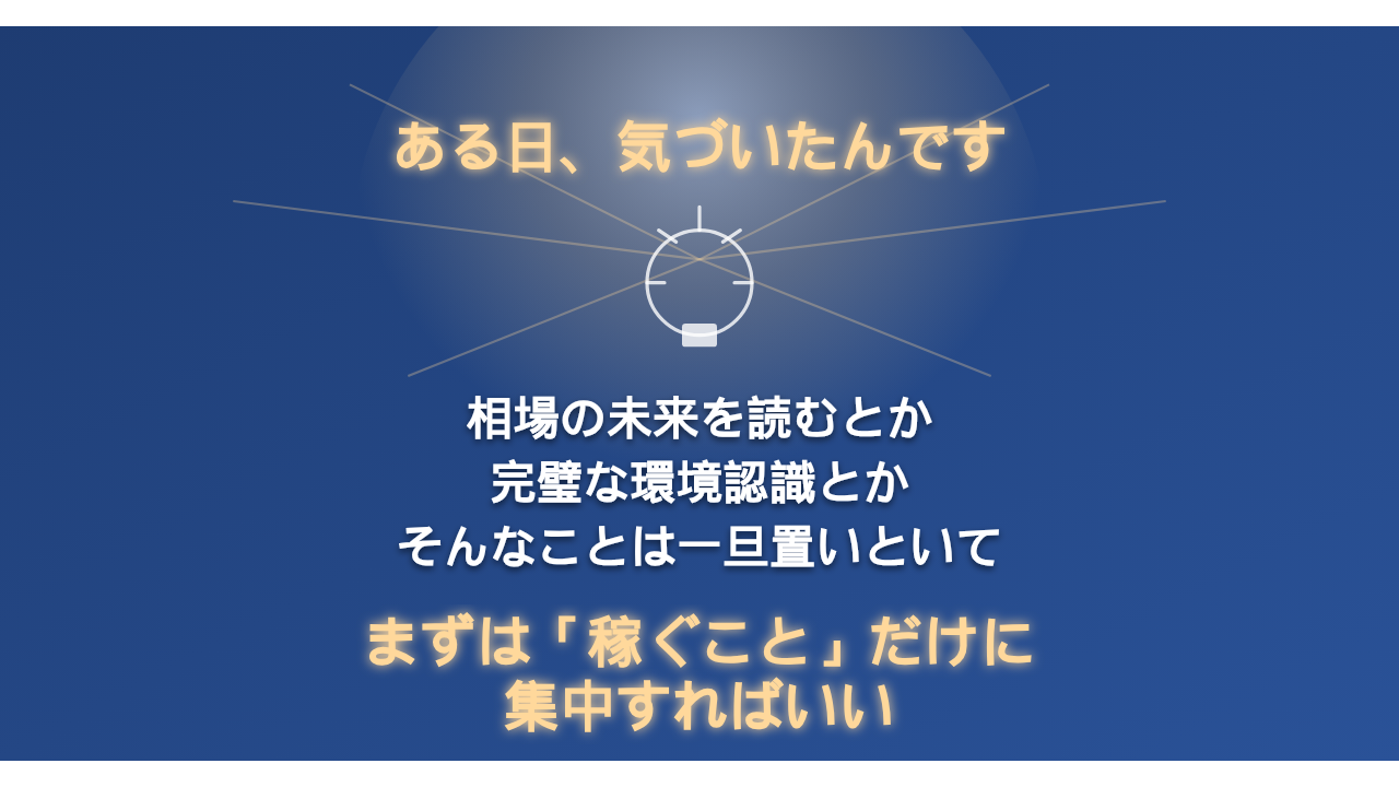 相場の未来を読むとか、完璧な環境認識をするとか、そんなことは一旦置いといて、まずは「稼ぐこと」だけに集中すればいいんじゃないか?