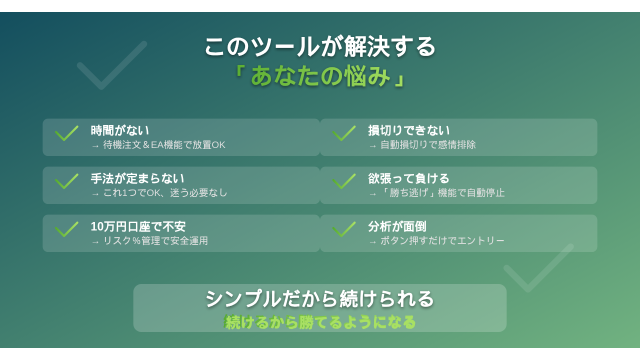このツールは、「FXで最も重要なのはリスク管理である」という信念のもとに作られています。