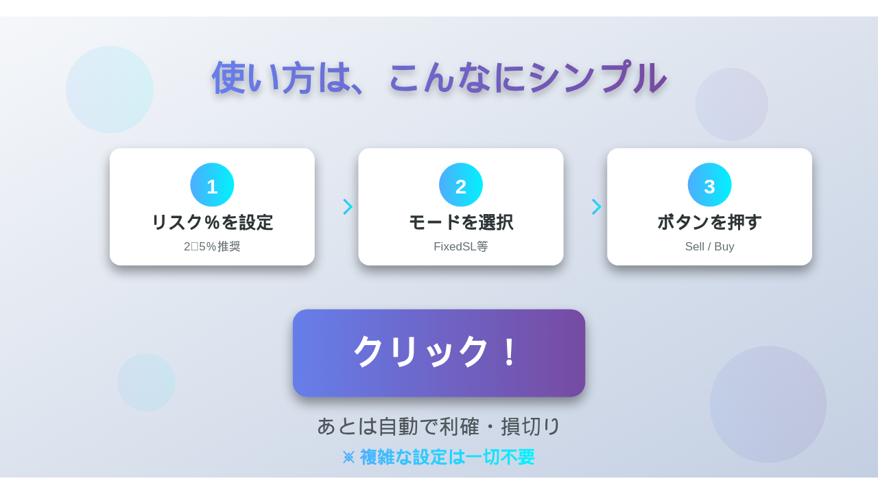 1. ワンクリック売買 複雑な設定は一切不要。ボタンを押すだけで、エントリーから決済まで完結します。