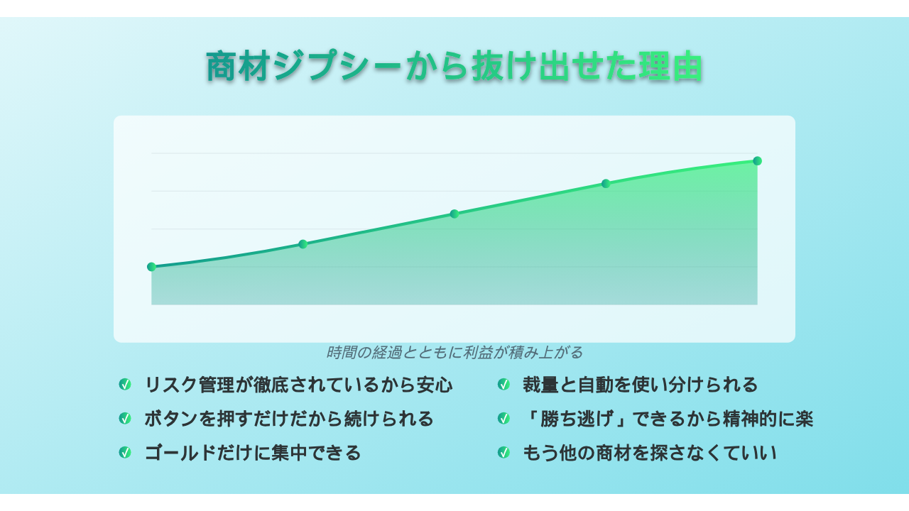 目標達成したら即終了。欲を出さず、着実に利益を積み重ねる喜びを味わえます。