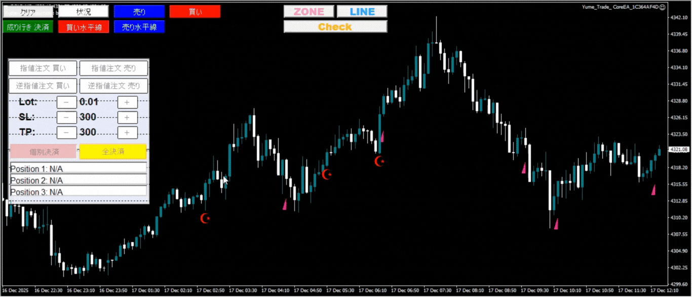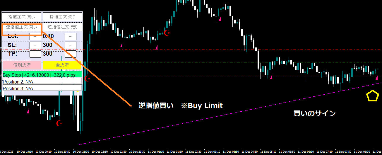 | 水平線決済 | 「買い水平線」「売り水平線」ワンクリックでSLとTPを挿入 |