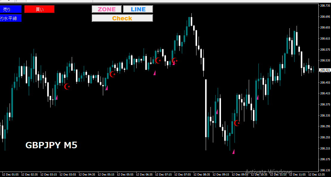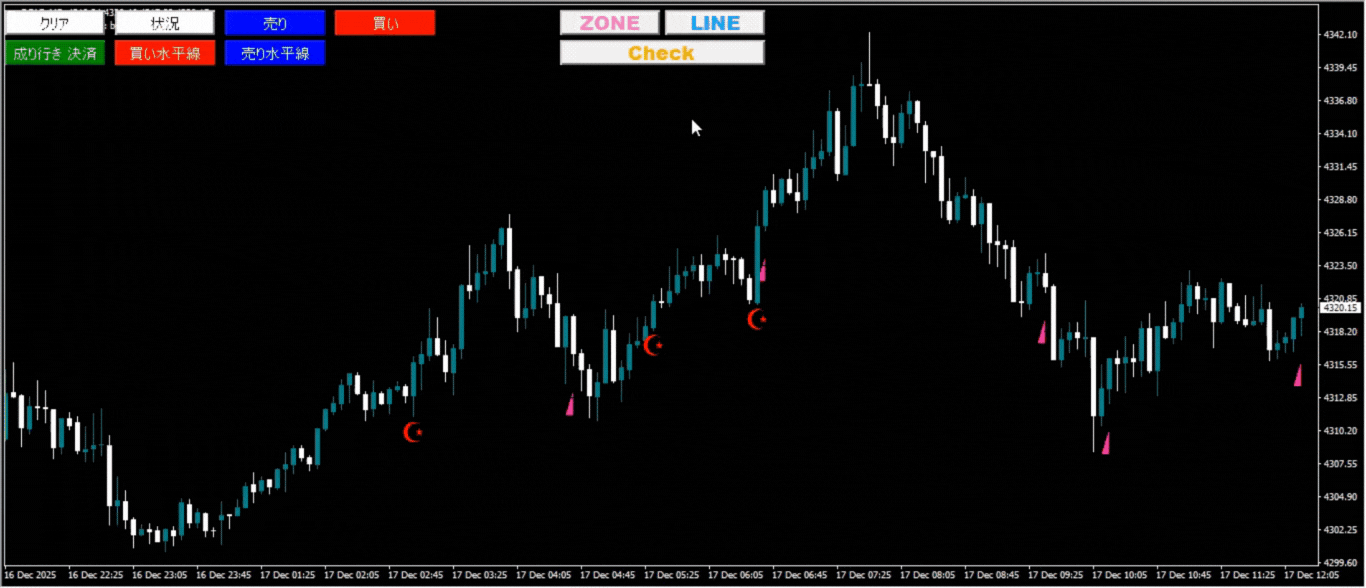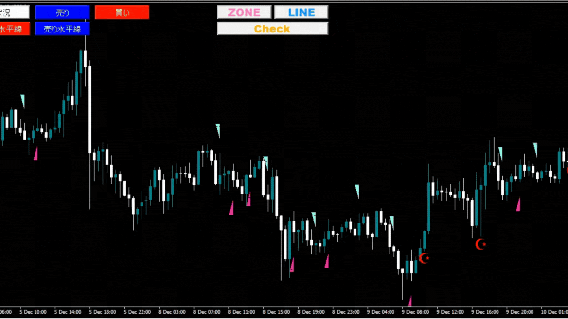 | ボタンでATRゾーンをチャートに描写 | 『ZONE』ボタンクリックでATRゾーンをチャート上に表示・非表示が可能です。 |