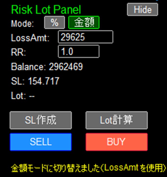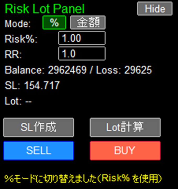 | InpRiskPercent | 初期リスク%(パネルから変更できます) | 1.0 |