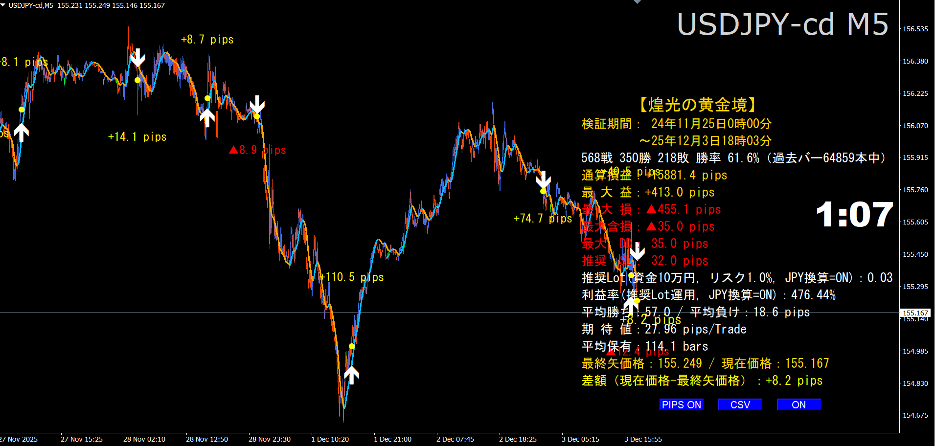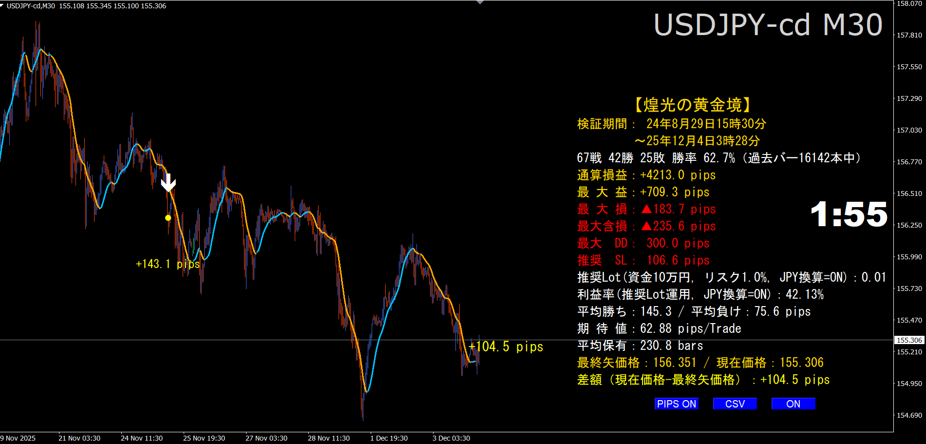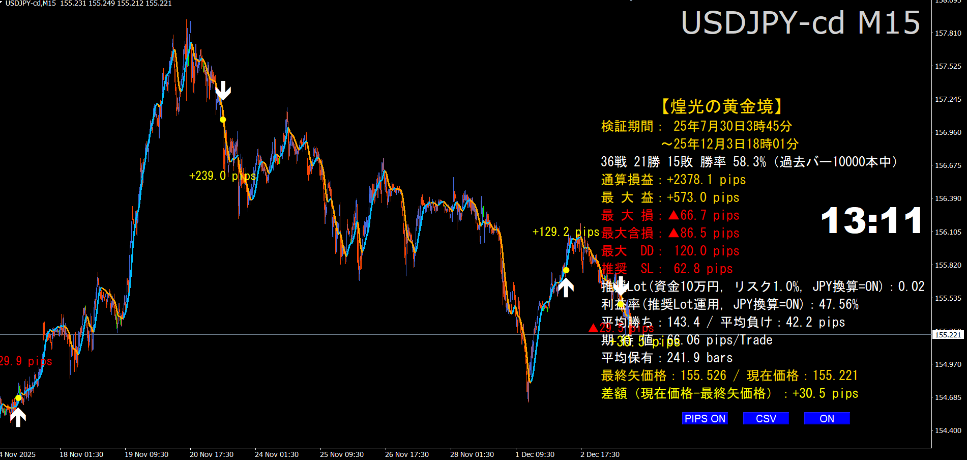 1.    右下のボタン:ON/OFF(集計パネル表示)、CSV(取引サマリ書き出し)、PIPS ON/OFF(過去pipsラベルの一括表示切替)が使えます。