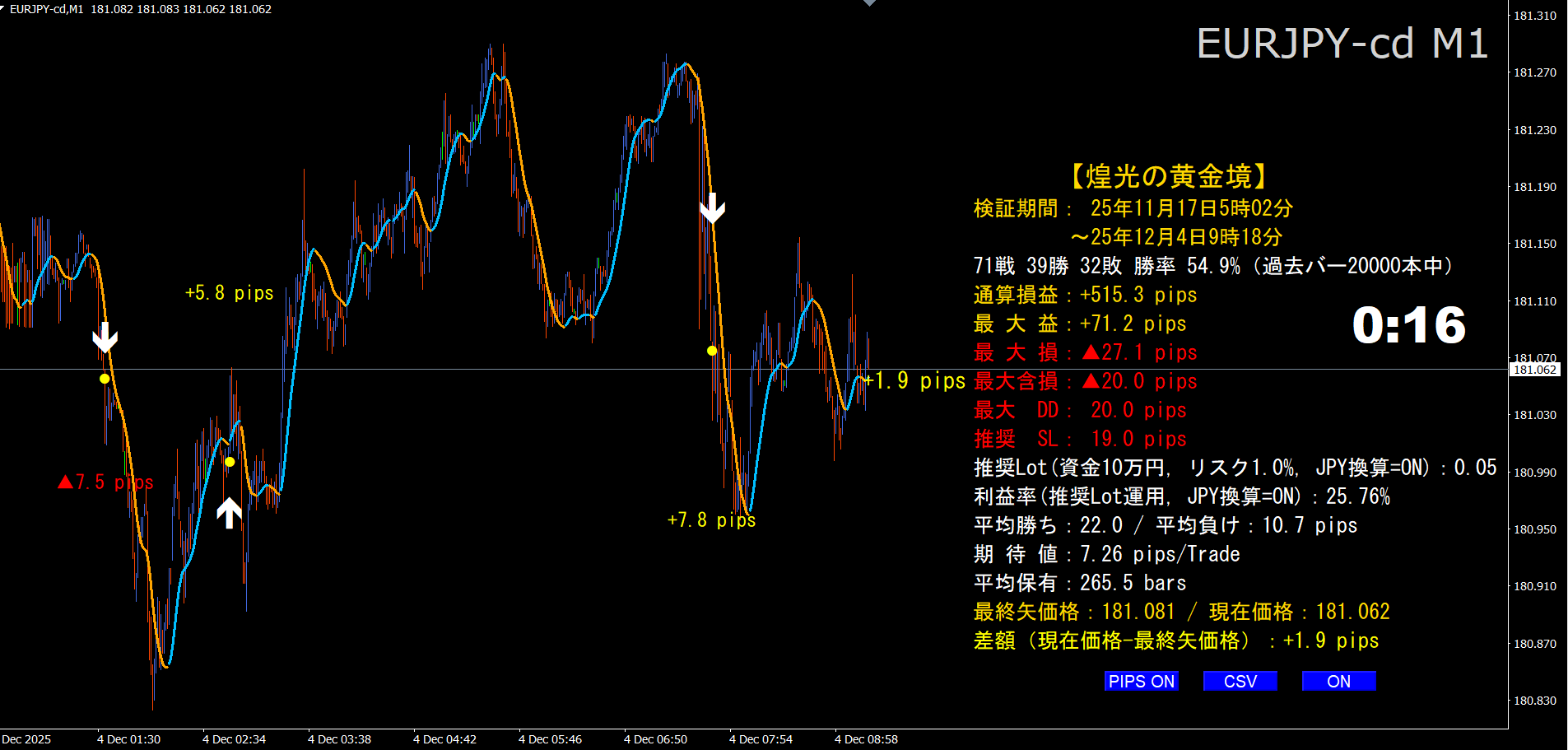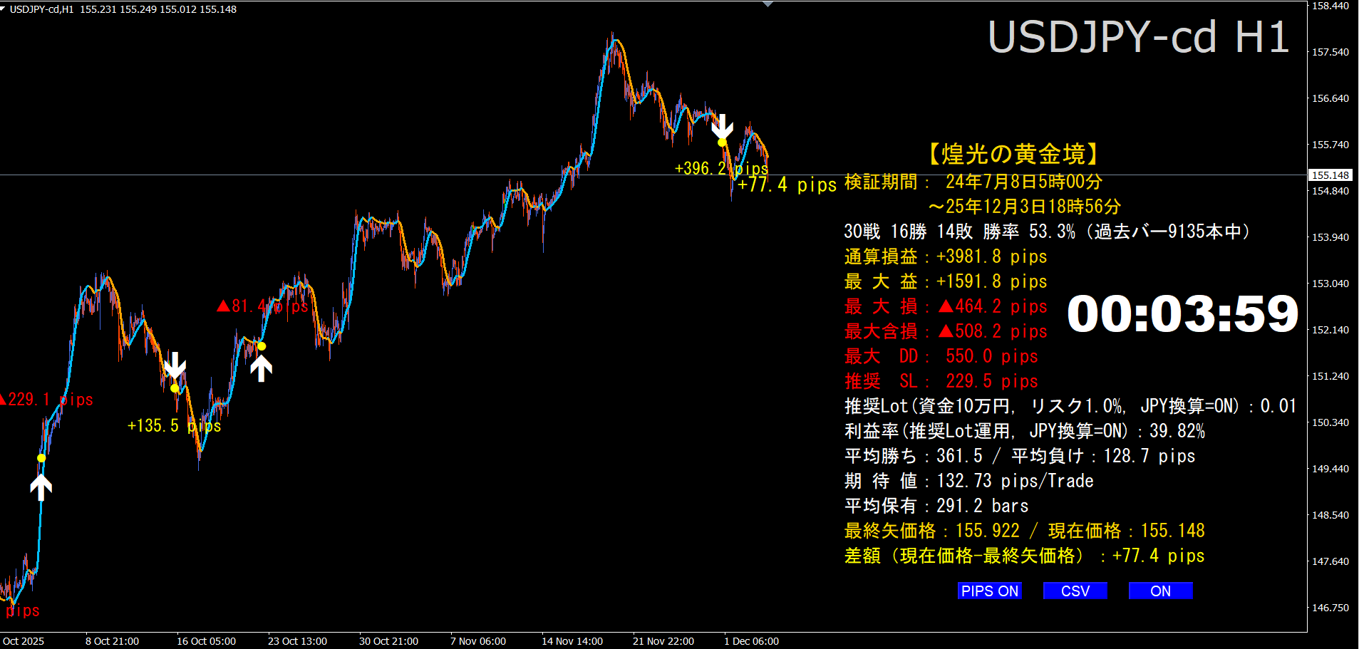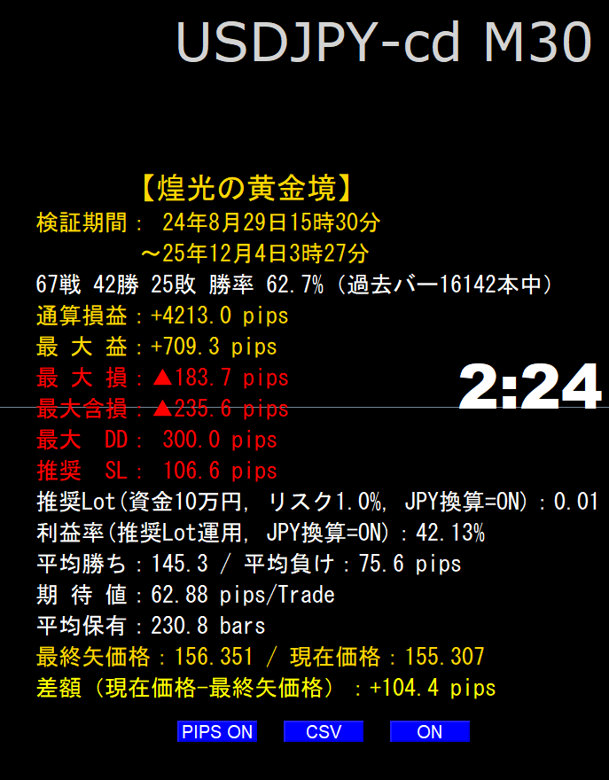 ·      右下パネル:トレード数/勝敗/勝率、通算損益、最大益/損、最大含み損(MAE)、最大DD、推奨SL/ロット、期待値など