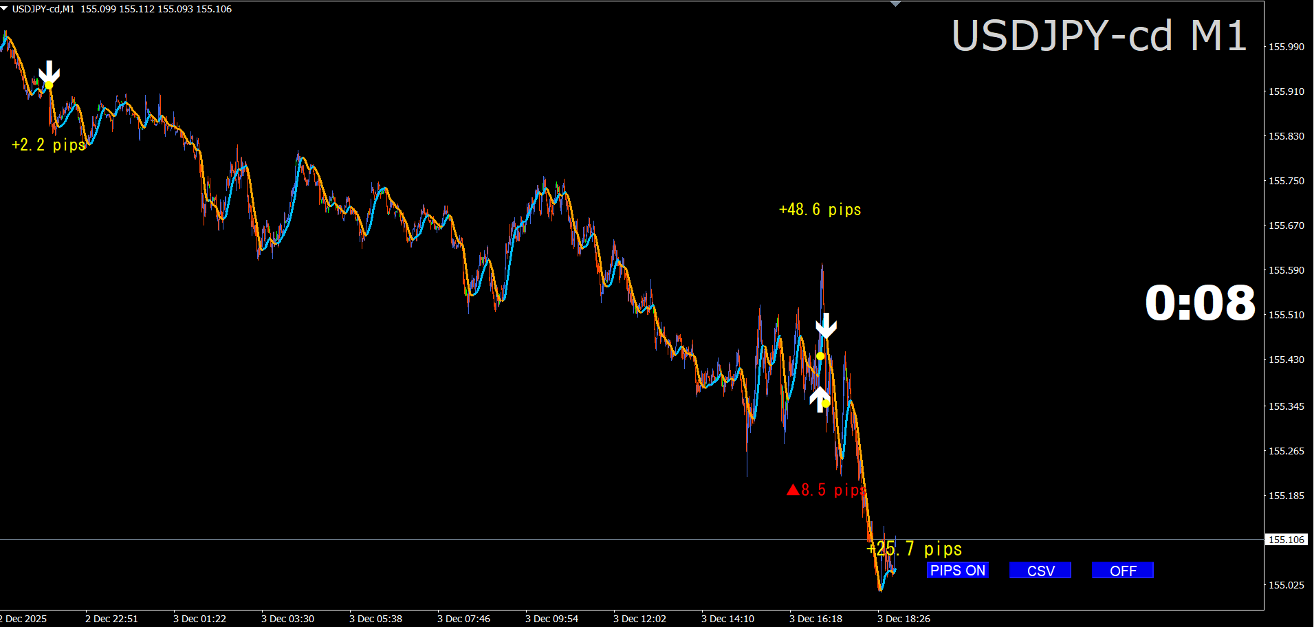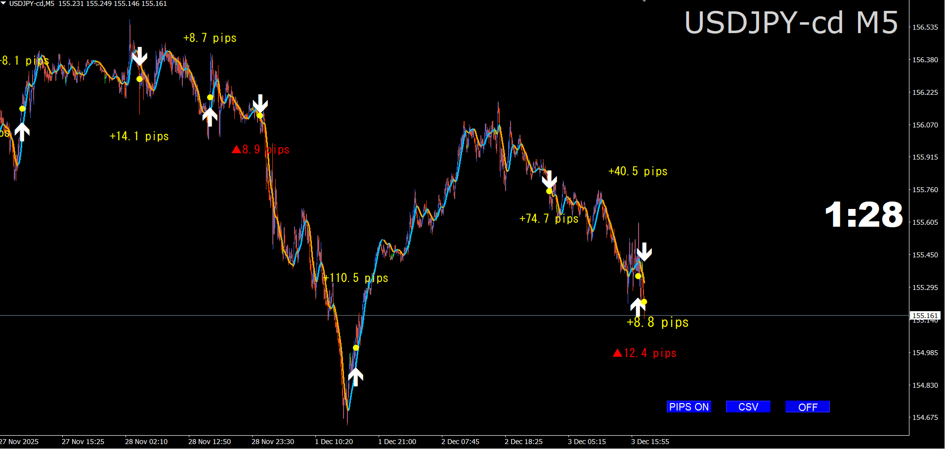 ·      黄色/赤色のpips文字:シグナル間の確定損益(+は黄色、負は赤+