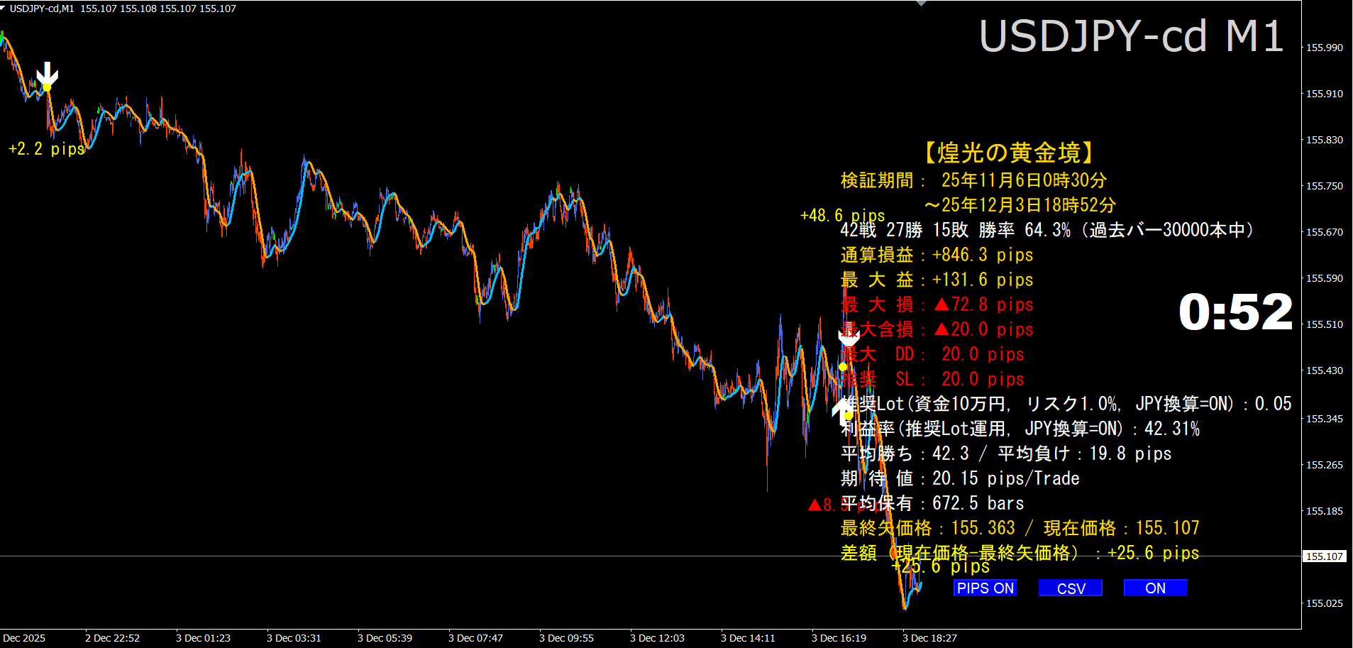 本インジケーターは、価格が一定期間の高値・安値レンジをブレイクした方向を検出し、交互制御(直近と同じ方向の連発を抑止)と SMMA(平滑移動平均)角度ゲートにより、優位性の低いシグナルをフィルタした上で矢印とドットを描画します。加えて、シグナル間の確定pips、勝率・通算損益・最大DD等を自動集計し、CSV出力やプッシュ通知、ライブpips表示(右側)にも対応しています。