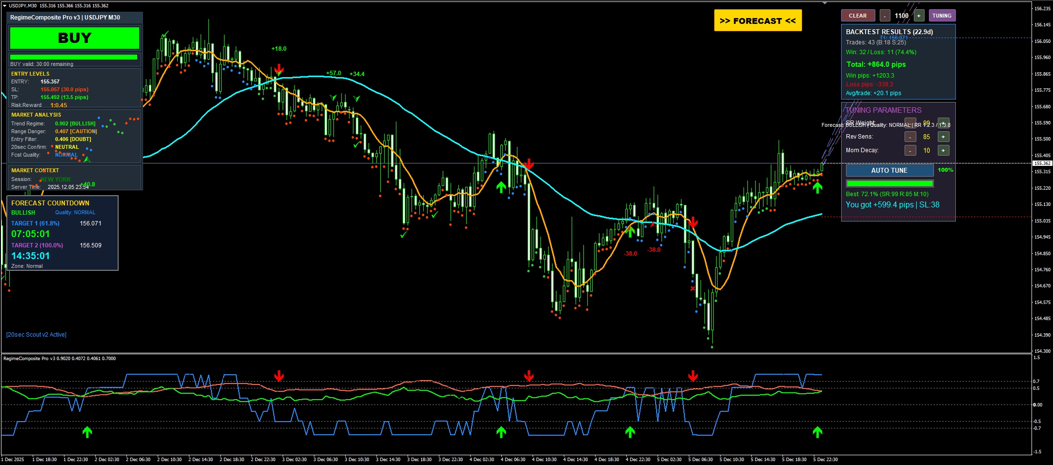 30分足チャート上では、もはや遅すぎることもあります。なので、バー確定前にも「プレシグナル」(黄/橙矢印)を早期発出します。